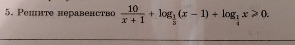10/(х+1) больше или равно log_(3)(x-1)+log_(4)x