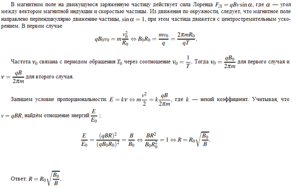 В постоянном магнитном поле заряженная частица движется по окружности. Когда индукцию магнитного поля стали медленно увеличивать, обнаружилось, что скорость частицы изменяется так, что кинетическая энергия частицы оказывается пропорциональной частоте её обращения. Найдите радиус орбиты частицы в поле с индукцией В, если в поле с индукцией В0 он равен R0.