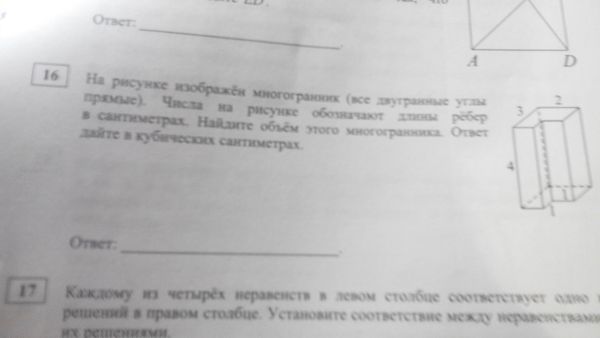 16 На рисунке изображён многогранник (все двугранные углы прямые). Числа на рисунке обозначают длины рёбер в сантиметрах. Найдите объём этого многогранника. Ответ дайте в кубических сантиметрах.