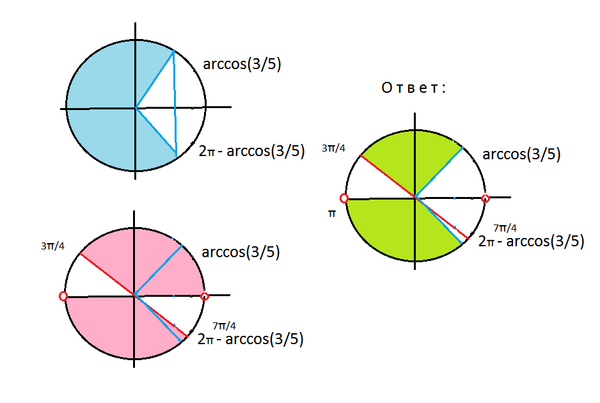 arccos(3/5)+2πk≤x < (3π/4)+2πk, k - целое и π+2πn < x≤ 2π-arccos(3/5)+2πn, n- целое