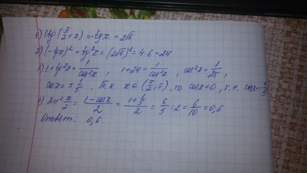 Найдите sin^2 x/2 , если ctg(п/2+х)=2√6 , х принадлежит (п/2;п)