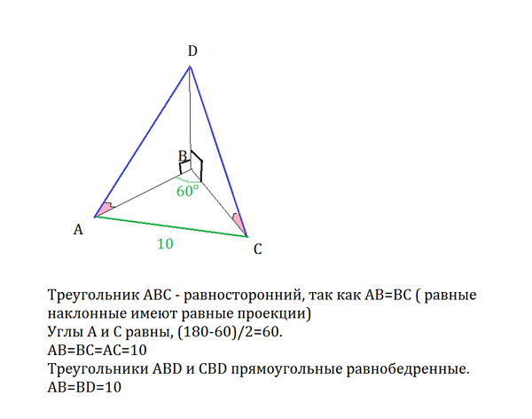 Из точки вне плоскости проведены к ней две наклонные, каждая из которых образует с плоскостью угол в 45. Найдите расстояние от данной точки до данной плоскости, если угол между наклонными равен 60 и расстояние между концами наклонных равно 10 см.