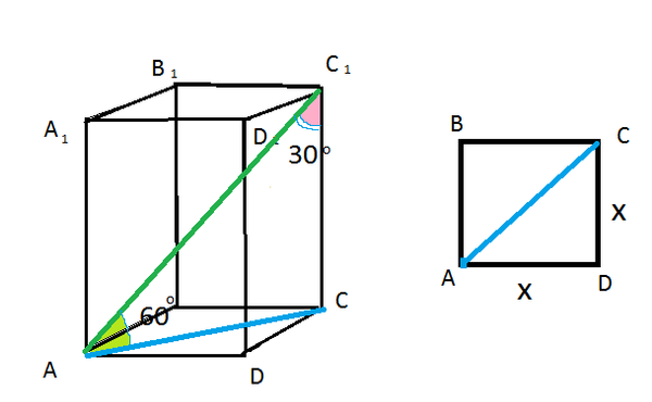 АС=АС1/2- катет против угла в 30 градусов равен половине гипотенузы. АС=4sqrt(3) CC1=AC1*sin60 градусов=8sqrt(3)*sqrt(3)/2=12 ABCD- квадрат, так как призма правильная. АВ=ВС=СD=AD=x x^2+x^2=(4sqrt(3))^2 2x^2=48 x^2=24 V=S(ABCD)*CC1=x^2*12=24*12=288