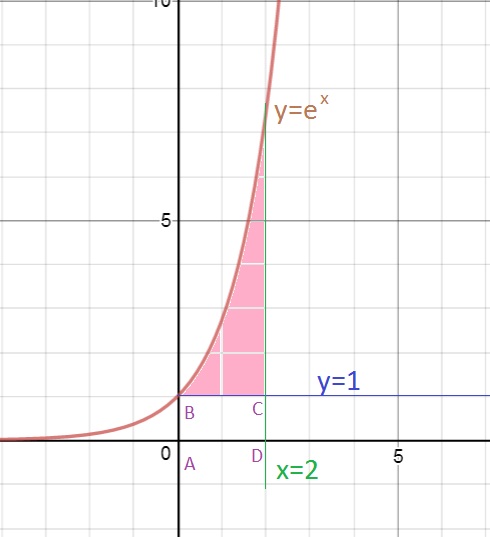 S=∫^(2)_(0)e^(x)dx-S(прямоугольника ABCD)= =e^(x)|^(2)_(0)-2*1=e^(2)-1-2=e^(2)-3