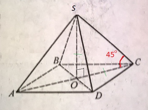 SO=ОС=SC*sin45 градусов =6sqrt(2)*(sqrt(2)/2)=6 АС=2ОС=12 BD=AC=12 - диагонали квадрата равны. S(квадрата АВСD)=(1/2)AC*BD=(1/2)*12*12=72 V(пирамиды SABCD)=(1/3)S(осн.)*Н= =(1/3)S(квадрата ABCD)*SO=(1/3)*72*6=144
