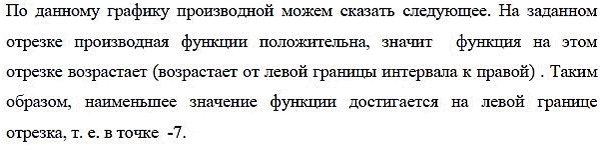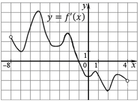 На рисунке изображен график у = f'(х) — производной функции f(х), определенной на интервале (–8;4). В какой точке отрезка [–7;–3] функция f(х) принимает наименьшее значение.