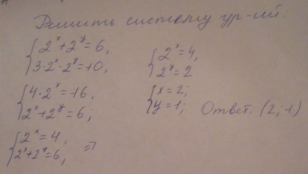 { 2^(x)+2^(y)=6; { 3*2^x-2^(y)=10...