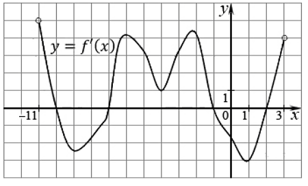 На рисунке изображен график у = f'(х) — производной функции f(х), определенной на интервале (–11;3). Найдите промежутки возрастания функции f(х). В ответе укажите длину наибольшего из них.