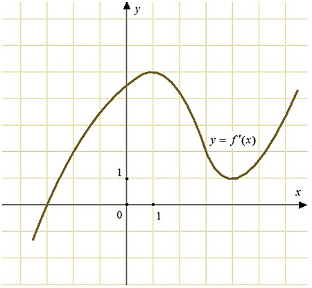 На рисунке изображен график у = f'(х) — производной функции f(х). Найдите абсциссу точки, в которой касательная к графику у = f(х) параллельна оси абсцисс или совпадает с ней.