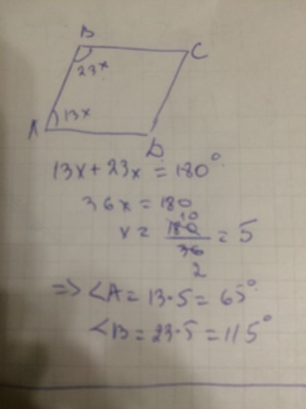 Сумма двух углов параллелограмма равна 180°. 13х+23х=180 36х=180 х=5 13×5=65°(меньший угол) 23×5=115°(больший угол) Ответ:65