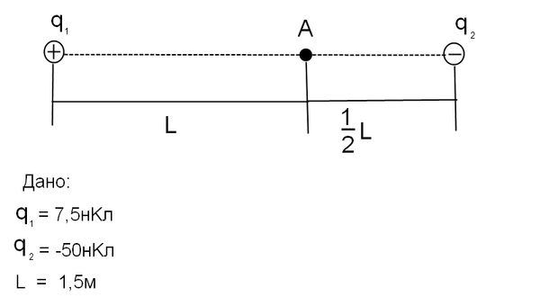 E=E1+E2=k*q1/L² + k*q2/(L/2)²=(k/L²)*(q1+4*q2)=9*10^9*(7.5+4*50)/2.25=830 В/м (знаки зарядов учтены, векторы напряженности оба в сторону отрицательного заряда!)
