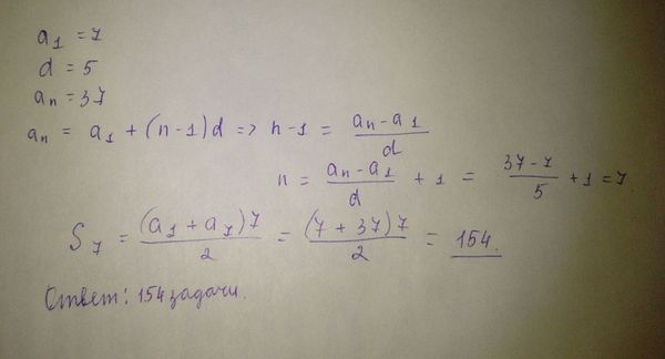 Андрей при подготовке к ЕГЭ поставил себе задачу — решать каждый день на 5 задач больше, чем в предыдущий. За первый день он решил 7 задач, а за последний — 37 задач. Сколько задач он решил всего?