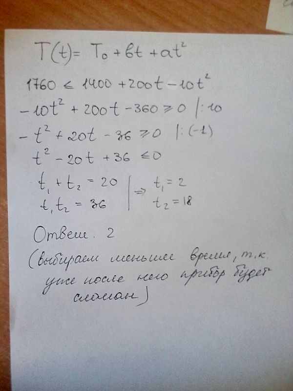 Для нагревательного элемента некоторого прибора экспериментально была получена зависимость температуры (в кельвинах) от времени работы: T(t) = T_(0) + bt - at^2, где t— время в минутах, Т_(0) = 1400 К, а = — 10 К/мин^2, b = 200 К/мин. Известно, что при температуре нагревателя свыше 1760 К прибор может испортиться, поэтому его нужно отключить. Определите, через какое наибольшее время после начала работы нужно отключить прибор. Ответ выразите в минутах.