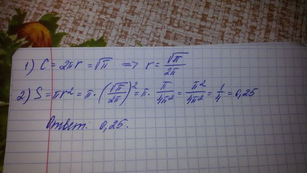 Найдите площадь круга, длина окружности которого равна sqrt(Pi)