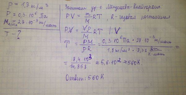 При какой температуре (по шкале Кельвина) плотность азота будет 1.8 кг/м3 при давлении 0.3 МПа?