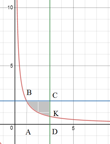 S=S(квадрата АВСD)-S( криволинейной трапеции АВKD)= =2*2-∫^3_(1)(2/x)dx= 4-(2lnx)|^3_(1)=4-3ln3+3ln1=4-2ln3+0=4-2ln3 О т в е т. 4-2ln3