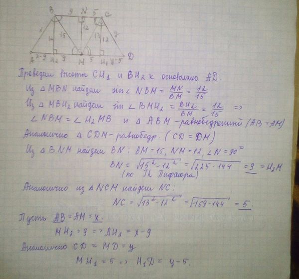 Биссектрисы тупых углов при основании трапеции пересекаются в точке, лежащей на другом её основании. Найдите стороны трапеции, если ее высота равна 12 см, а длина биссектрис 15 см и 13 см.