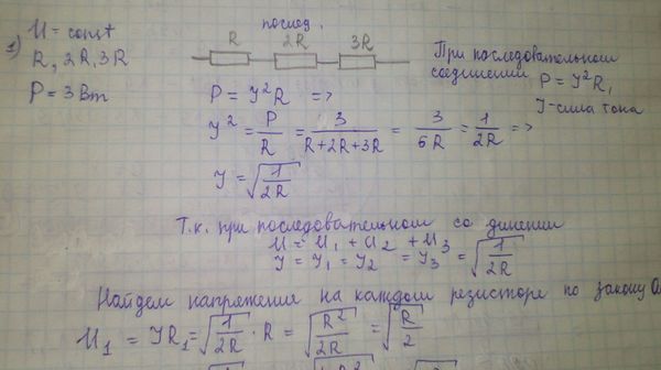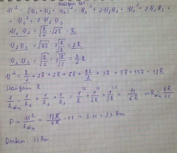 В электрической сети напряжение поддерживается постоянным. При подключении к этой сети трёх последовательно соединённых резисторов с сопротивлениями R, 2R и 3R в цепи выделяется мощность 3 Вт. Какая мощность будет выделяться в цепи при параллельном соединении этих трех резисторов и подключении к той же сети?