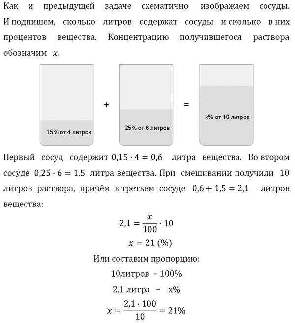Смешали 4 литра 15-процентного водного раствора некоторого вещества с 6 литрами 25-процентного водного раствора этого же вещества. Сколько процентов составляет концентрация получившегося раствора?