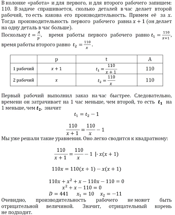Заказ на 110 деталей первый рабочий выполняет на 1 час быстрее, чем второй. Сколько деталей в час делает второй рабочий, если известно, что первый за час делает на 1 деталь больше?