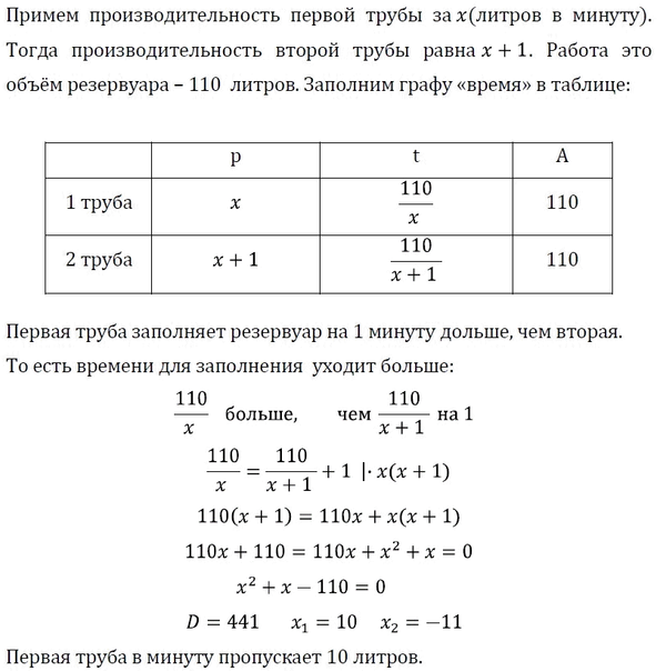 Первая труба пропускает на 1 литр воды в минуту меньше, чем вторая. Сколько литров воды в минуту пропускает первая труба, если резервуар объемом 110 литров она заполняет на 1 минуту дольше, чем вторая труба?
