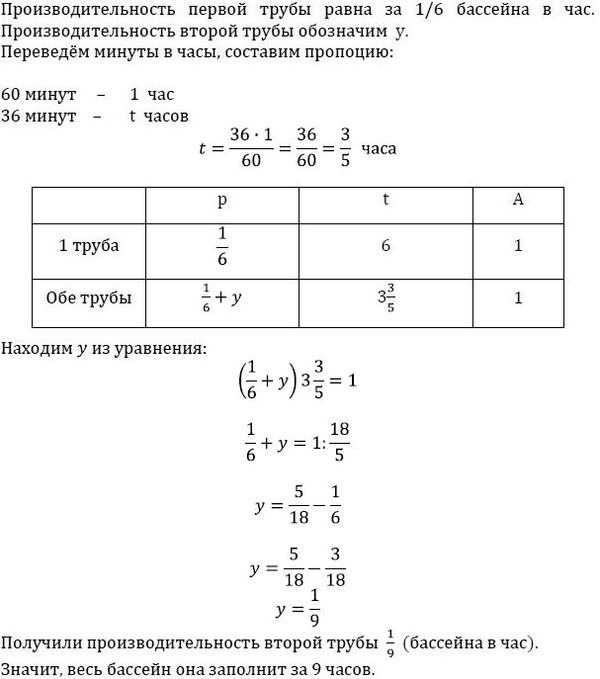 Две трубы наполняют бассейн за 3 часа 36 минут, а одна первая труба наполняет бассейн за 6 часов. За сколько часов наполняет бассейн одна вторая труба?