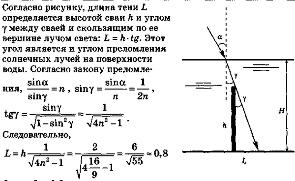 В дно водоема глубиной 3 м вертикально вбита свая, скрытая под водой. Высота сваи 2 м. Угол падения солнечных лучей на поверхность воды равен 30°. Определите длину тени сваи на дне водоема. Коэффициент преломления воды n = 4/3.