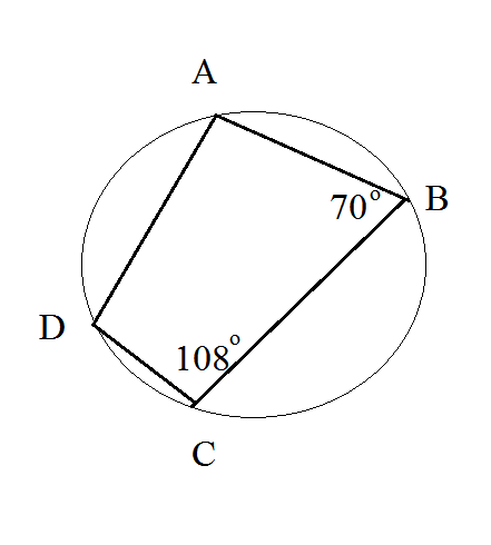 Четырехугольник ABCD вписан в окружность. Найдите градусную меру угла А, если известно, что угол B = 70°, угол C = 108°.