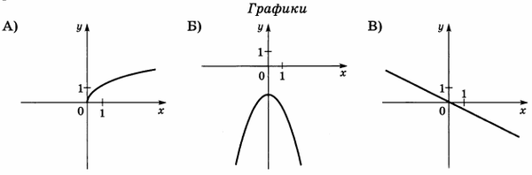 Установите соответствие между графиками функций и формулами, которые их задают. [b]Формулы[/b] 1) y=-(1/2)x 2) y=-x^2-2 3) y=sqrt(x)