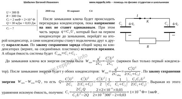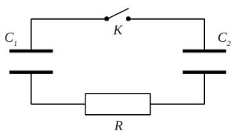Конденсатор С заряжен до напряжения U = 300 В и включен в последовательную цепь из резистора R = 300 Ом, незаряженного конденсатора C2=2 мкФ и разомкнутого ключа К (см. рисунок). В процессе перезарядки конденсаторов после замыкания ключа в цепи выделяется количество теплоты Q = 30 мДж. Чему равна емкость конденсатора C?