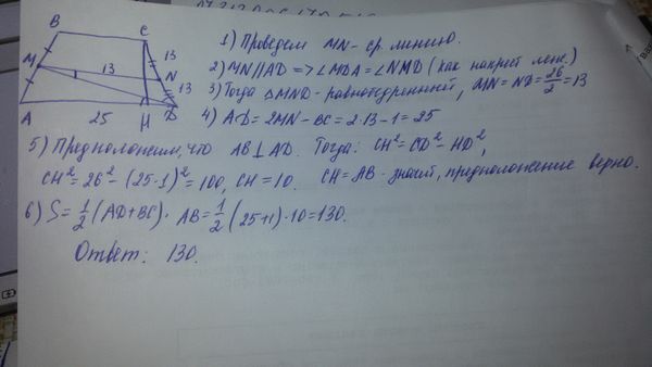 Боковые стороны АВ и CD трапеции ABCD равны соответственно 10 и 26, а основание ВС равно 1. Биссектриса угла ADC проходит через середину стороны АВ. Найдите площадь трапеции.