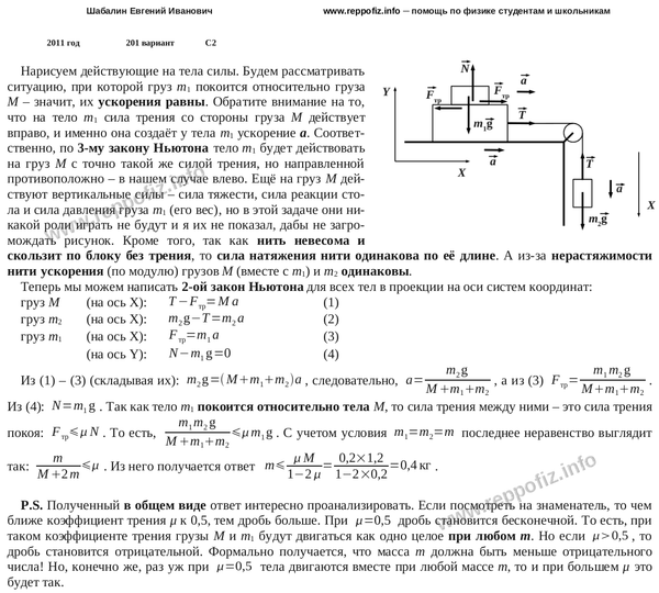 Система грузов M, m1 и m2, показанная на рисунке, движется из состояния покоя. Поверхность стола горизонтальная гладкая. Коэффициент трения между грузами M и m1 равен u= 0,2. Грузы m1 и m2 связаны легкой нерастяжимой нитью, которая скользит по блоку без трения. Пусть M = 1,2 кг , m1 = m2 = m . При каких значениях m грузы M и m1 движутся как одно целое?
