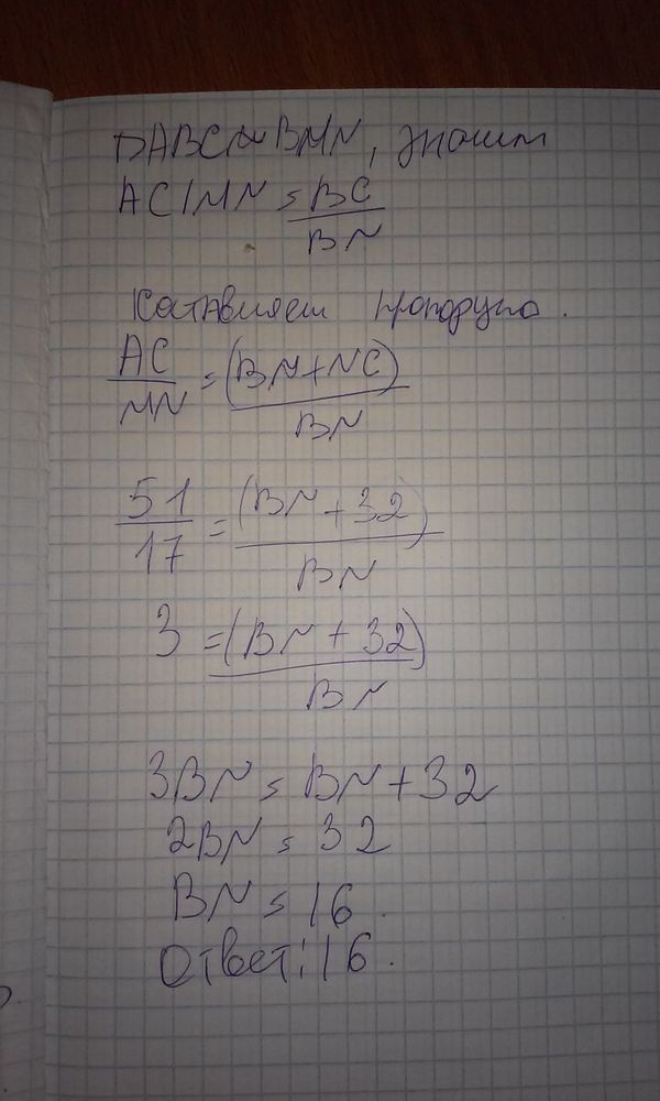 Прямая, параллельная стороне АС треугольника АВС, пересекает стороны АВ и ВС в точках М и N соответственно. Найдите BN, если MN =17, АС = 51, NC = 32.