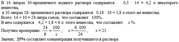 Смешали 14 литров 30-процентного водного раствора некоторого вещества с 10 литрами 18-процентного раствора этого же вещества. Сколько процентов составляет концентрация получившегося раствора?