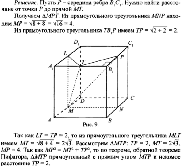 Дан куб ABCDA1B1C1D1 с ребром 2sqrt(2).Найти расстояние от середины ребра В1С1 до прямой МТ, где М и T - середины ребер AD и А1В1 соответственно.