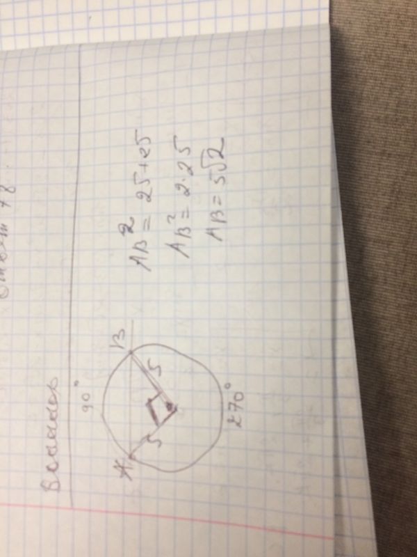 Хорда AB делит окружность с центром O на дуги 270 и 90. Найдите АВ,r=5см