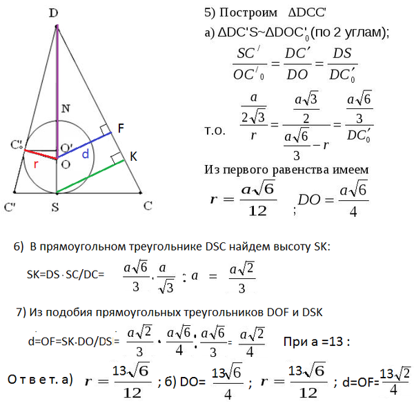 Сфера касается всех ребер правильного тетраэдра с ребром 13. Найдите: а) радиус сферы; б) расстояния от центра сферы до вершины, грани и ребра тетраэдра.