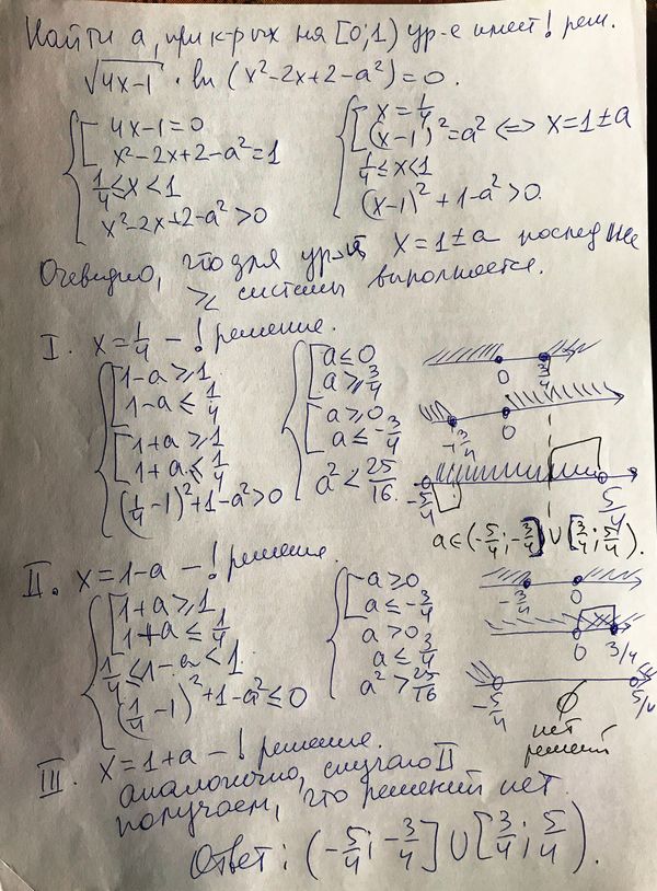 sqrt(4x-1)*ln(x^2-2x+2-a^2)=0 Найти все параметры a, при котором только один корень x принадлежит отрезку [0;1].