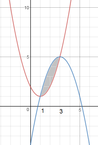 y=(x–1)2+1=x2–2x+2 График красного цвета у=–(х–3)2+5 y=–x2+6x–4 график синего цвета Графики пересекаются в точках с абсциссами х=1 и х=3 S=∫31 (–x2+6x–4–x2+2x–2)dx= =∫31(–2x2+8x–6)dx= =((–2x3/3)+(8x2/2)–6x)|31=(–18+36–18+(2/3)–4+6)= =8/3