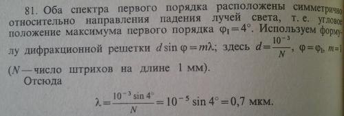 Дифракционная решетка содержит 100 штрихов на 1 мм длины. Определите длину волны монохроматического света, падающего на решетку нормально, если угол между двумя спектрами первого порядка 8°.