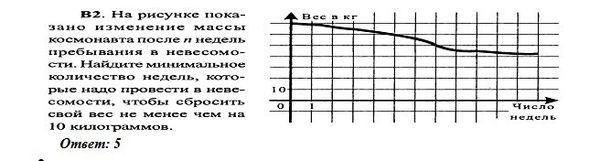 На рисунке показано изменение массы космонавта после n недель пребывания в невесомости.Найдите минимальное количество недель,которые надо провести в невесомости,чтобы сбросить свой вес не менее чем на 10 килограммов.