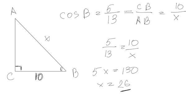 в прямоугольном треугольнике АВС угол С равен 90*, ВС =10см , cosВ = 5/13.Найти гипотенузу АВ.