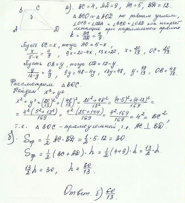 Основания трапеции равны 4 и 9, а её диагонали равны 5 и 12. а) Докажите, что диагонали трапеции перпендикулярны. б) Найдите высоту трапеции.