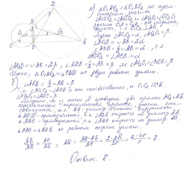 а) Докажите, что треугольники CBD и O1AO2 подобны.