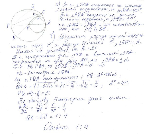 б) Известно, что sin AOC = sqrt(15)/4. Прямые РС и AQ пересекаются в точке К. Найдите отношение QK:KA