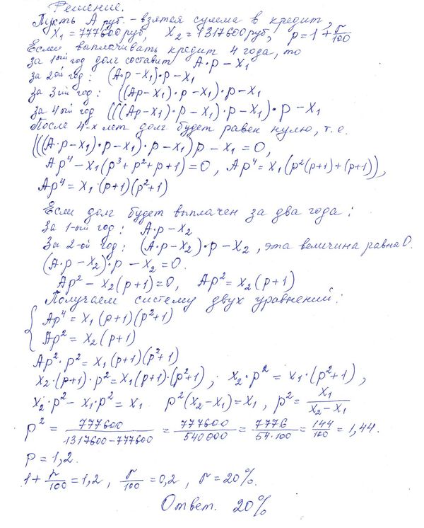 Найдите r, если известно, что если выплачивать по 777600 рублей , то кредит будет погашен за 4 года, а если ежегодно выплачивать по 1317600 рублей, то кредит будет полностью погашен за 2 года?