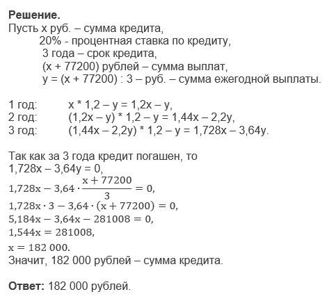 Сколько рублей было взято в банке, если известно, что кредит был полностью погашен тремя равными платежами (то есть за 3 года) и сумма платежей превосходит взятую в банке сумму на 77200 рублей?