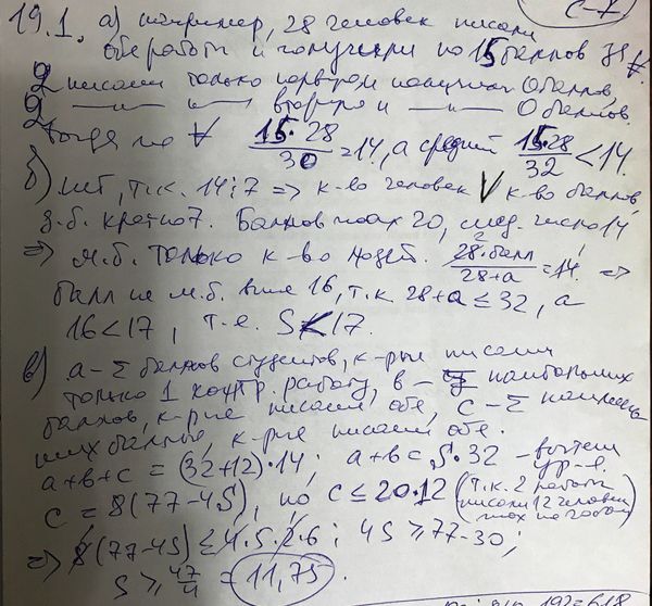 Каждый из 32 студентов или писал одну из двух контрольных работ, или писал обе контрольные работы. За каждую работу можно было получить целое число баллов от 0 до 20 включительно. По каждой из двух контрольных работ в отдельности средний балл составил 14. Затем каждый студент назвал наивысший из своих баллов (если студент писал одну работу, то он назвал балл за нее). Среднее арифметическое названных баллов оказалось равно S.