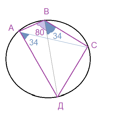 ∠СAД=∠СВД=34° - углы, опирающиеся на одну и туже дугу СД. ∠АВС=∠АВД+∠СВД=80°+34°=114°