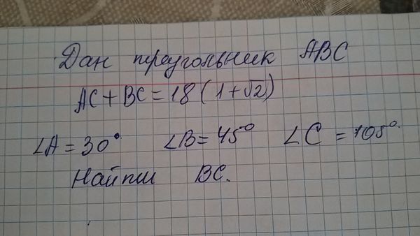 Пусть ВС=х; тогда АС =18+18sqrt(2)-x По теореме синусов: ВС/sin30 градусов= АС/sin 45 градусов. х/(1/2)=(18+18sqrt(2)-x)/(sqrt(2)/2) Перемножаем крайние и средние члены пропорции: х*sqrt(2)=18+18sqrt(2)-x x(1+sqrt(2))=18*(1+sqrt(2)) x=18 О т в е т. 18